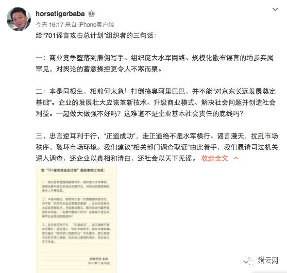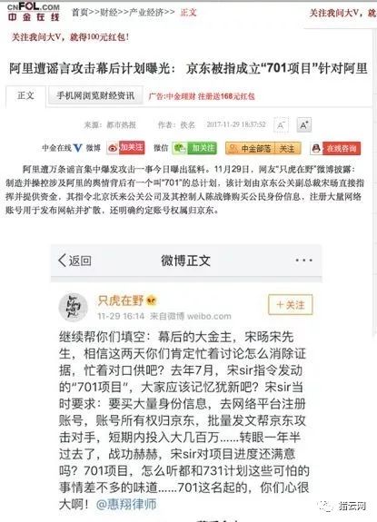 做出如此回应之时,阿里巴巴遭遇黑稿风暴背后的地下组织正逐渐清晰。有媒体报道称:北京沃来公关公司成立“701项目”购买大量身份信息注册网络账号组织黑文生产及扩散,其控制人为京东前新媒体经理陈战锋,而京东公关副总裁宋某为“701项目”的资金提供方与直接指挥者。