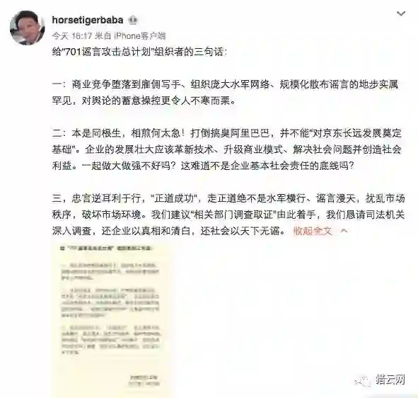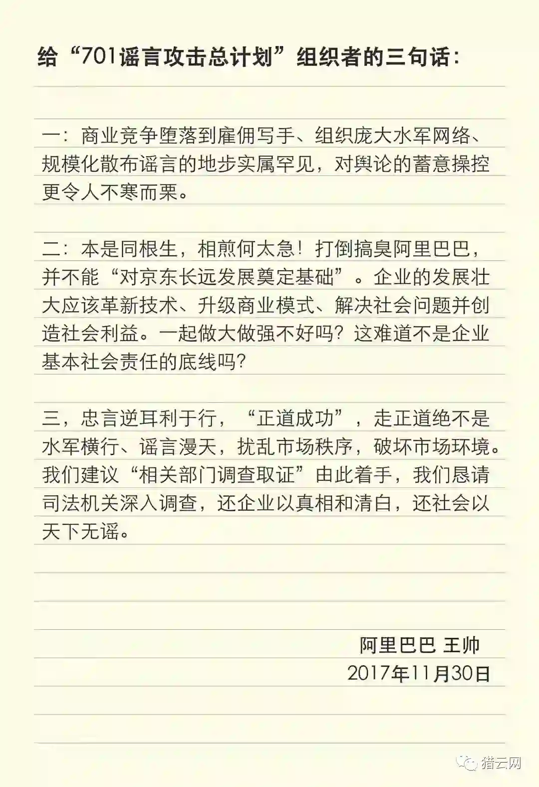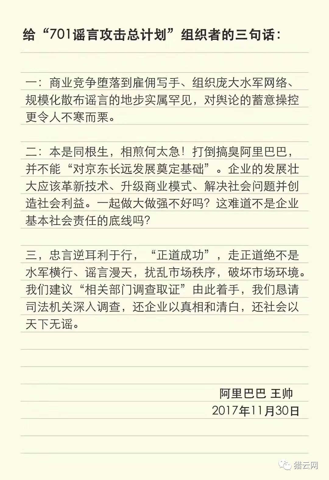 针对阿里巴巴遭遇黑稿风暴,阿里巴巴市场公关委员会主席王帅今日发布文章《给“701谣言攻击总计划”组织者的三句话》,以“逆耳忠言”回应京东:商业竞争堕落到操控舆论攻击同行的地步令人不寒而栗;打倒阿里并不能给京东带来益处;“正道成功”绝不是以谣言破坏市场环境。