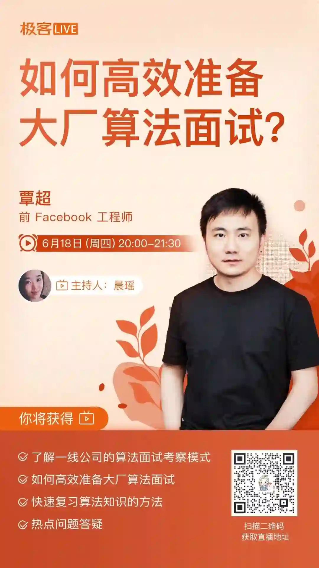 今晚 20:00,覃超老师我想和你聊聊《如何高效准备大厂算法面试》,欢迎你来收听。