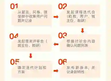 每期训练营全部结束后,班主任会再次发起问卷,并邀请助教、学员代表,与极客大学的教研组、学习服务组共同进行迭代评审会,针对前期收集的用户反馈逐一讨论,确定接下来的迭代方向。具体流程如下: