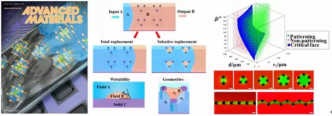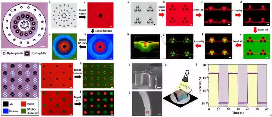 在上述研究基础上,他们利用微结构模板来调控不相容的流体界面形成图案化。利用固体微结构调控流体间相互取代过程,他们提出了一种任意不相容流体界面间的流体图案化技术(图1)。结合理论分析,他们提出了微结构浸润性和几何结构的设计原则,并用于制备不同形貌的流体图案,实现了流体间界面的可编程图案化(图2左)。这种以微流体技术为基础的对溶液的在微米和纳升尺度的调控,在以溶液加工为主体的器件制备技术中具有重要的应用。他们把流体图案化技术与功能材料的蒸发组装技术结合起来,实现了微型立体光电探测器的制备,显示出了良好的光电响应性(图2右)。该工作在发展微型器件的制备新方法方面具有重要的意义,其成果作为前封面报道发表于近日的Adv. Mater. 2018, 1802172上。