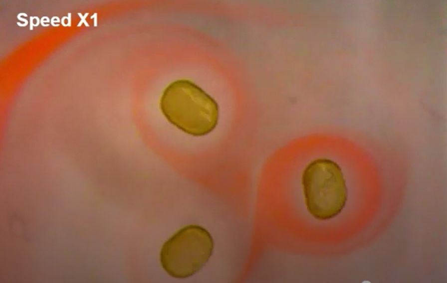 这些液滴相互吸引,宛如一组花样游泳运动员,以完美的一致性动作,形成一个优雅的漩涡。刘绪博说:“仿佛是舞蹈的小液滴。”