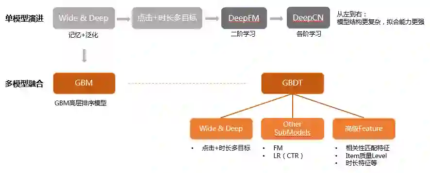 引入GBM对submodel和高级特征等信号做集成学习,效果要优于单模型。从计算学习理论上看,Wide&Deep是high-variance模型,容易过拟合(wd模型的训练比评估指标高7%)。GBM通过boosting的方式组合集成多个submodel和高级特征,更好地发挥各自不同的作用和优势互补,同时从整体上有更好的可解释性。