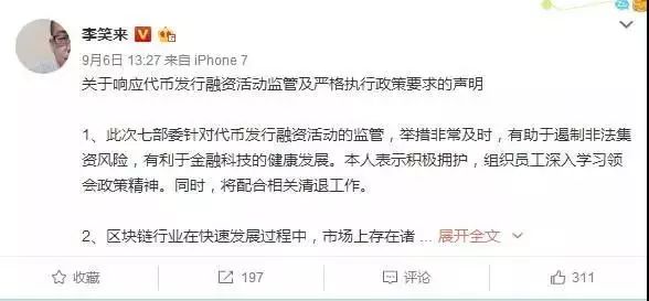 却又在央行联合七部委下发的《关于防范代币发行融资风险的公告》后,慌忙澄清并谄媚表态。