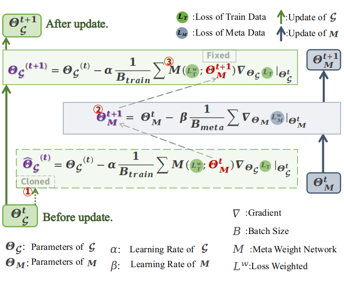 通过 nested meta learning 优化过程,我们将得到有助于本次训练的权重信息,使得在真正梯度下降并更参数的过程,是在学到有效的权重参数的指导下进行: