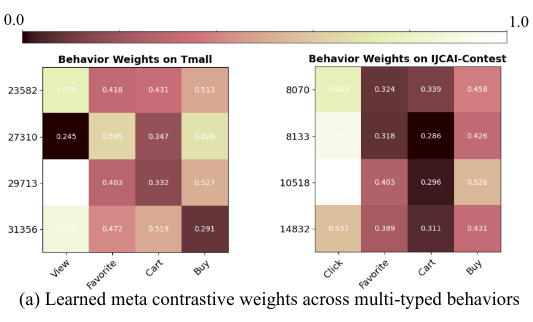我们采样了一些 CML 建模的用户,并可视化了 meta contrastive 学到的权重,它们表示了个性化的 user 多行为偏好。不同的 user 学到不同的 weights 表明该模块的有效性。