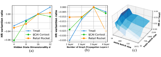 作者对三个模型的主要参数做了实验:i)GNN 的层数 ii)embedding 的大小 iii)meta batch size&train batch size。实验结果表明当 GNN 层数增加,embedding 会得到更高阶的交互信息进而使得模型的结果提升,但是过多的层数会导致 oversmoothing 问题而带来结果的下降;当 embedding 的大小增加时,表征能表示更丰富的信息,进而带来结果提升;我们分别从 {128、256、512、1024、2048} 和 {256、512、1024、2048} 范围内搜索 CML 的 meta batch size 和 train batch 的大小,在 3D 图中,颜色越深表示性能越好。当 meta 网络的采样批量小于基图网络时,模型性能更好。