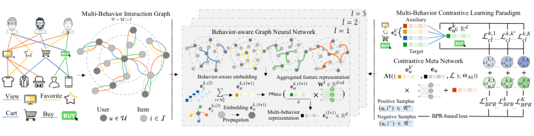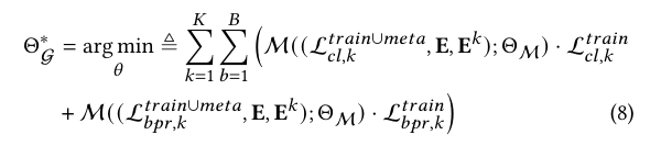 随后模型会将提取出来的 meta knowledge 送入基于元学习的权重网络(meta weight network)中,从而学习出多行为聚合函数中用户定制化的损失函数权重。