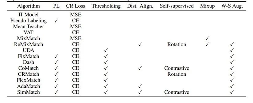 (3)为了对研究人员更加友好,研究员们开源实现了14种 SSL 算法并开源了一个模块化代码库和相关的配置文件以供研究者轻松再现 USB 报告中的结果。为了快速上手,USB 还提供了详细的文档和教程。此外,USB 还提供了 pip 包以供使用者直接调用 SSL 算法。研究员们承诺未来会在 USB 中不断加入新的算法(例如不平衡半监督算法等)和更多更具挑战性的数据集。表2展示了 USB 中已支持的算法和模块。
