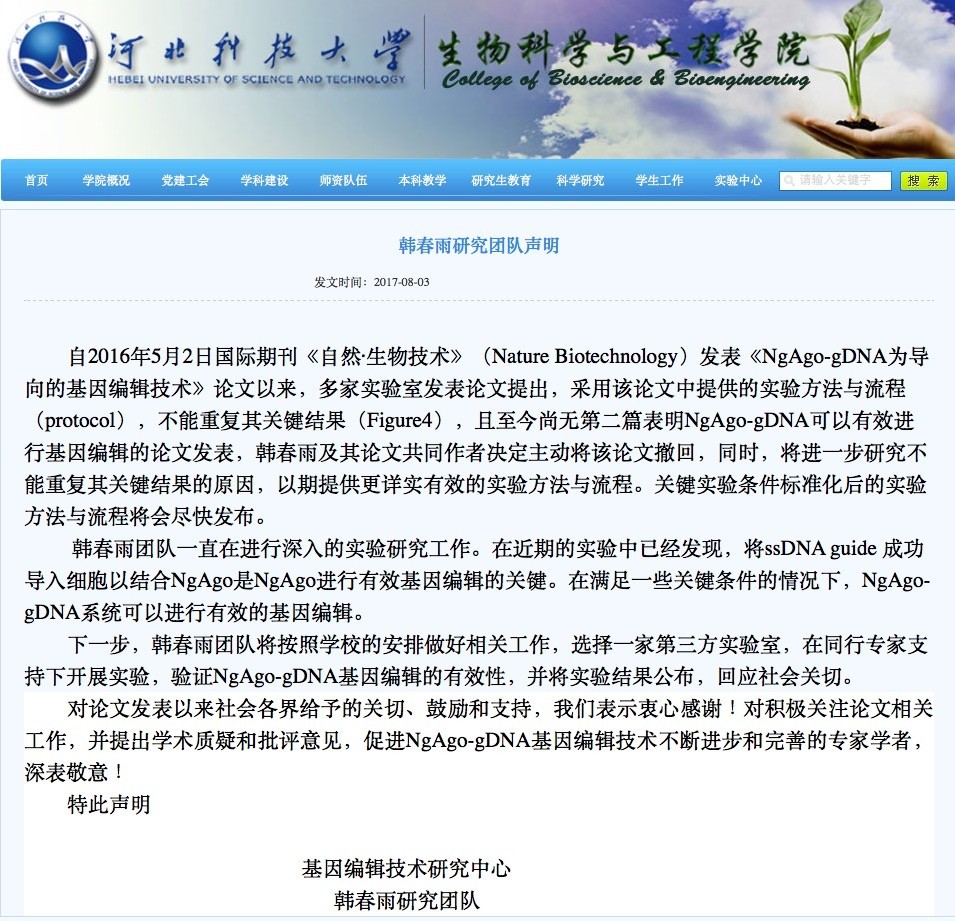 河北科技大学生物科学与工程学院发布韩春雨团队声明: