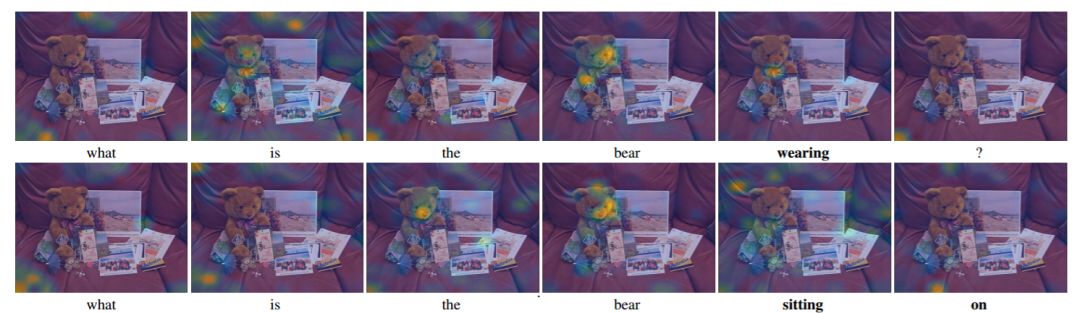 图 5:本文所述模型产生的动态注意力图。输入答案:「领结」(顶部)、「沙发」(底部)。因为答案不同,所以在生成输出问题时,模型会生成完全不同的聚焦图。