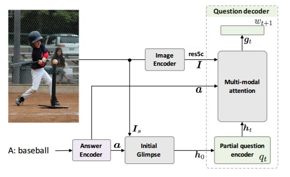 尽管与 VQA 密切相关,但现有的 VQA 模型无法解决 iVQA 问题。这是因为从答案中得到的可参考信息比从问题中得到的更少。此外,虽然答案一般都是由短语或几个单词组成的短句子,但是 iVQA 模型生成的问题应该是由较长单词序列组成的完整句子。iVQA 的关键在于,随着下一个单词的产生,模型有选择地、动态地参与图像的不同区域。这种动态的注意力机制必须以回答和已经生成的部分句子为条件。为此,研究者提出了一种基于动态多模态注意力的新 iVQA 模型,这种模型可以生成不同的、语法正确且内容相关的的问题,这些问题都能匹配所输入的答案。
