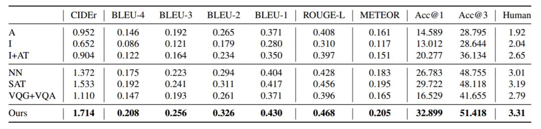 之前主要使用标准机器翻译指标评估问题生成方法,例如 BLEU、METEOR 等。这些自动指标与人类对问题生成的判断相关,但它们只能从这些模型成功或失败的条件和原因等角度来简单地判断问题生成模型。本文第一次提出具有替代性和互补性的基于排名的评价指标,给定图像和答案,该指标基于 iVQA 模型对替代干扰项中的标注问题进行排序。当使用这种模型时,通过控制干扰项可以更好地理解不同模型的成功和失败。其次,本论文对 iVQA 一对多的性质进行了人工评估,即多个可能的问题都有一样的答案。令人欣慰的是,人工评估的得分与我们提出的新的排序指标是高度相关的。