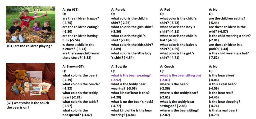 图 3:iVQA 的定性结果。括号内的数字越大,意味着置信度越高。紫色是根据注意力生成的问题,在图 5 中会进行详细说明。