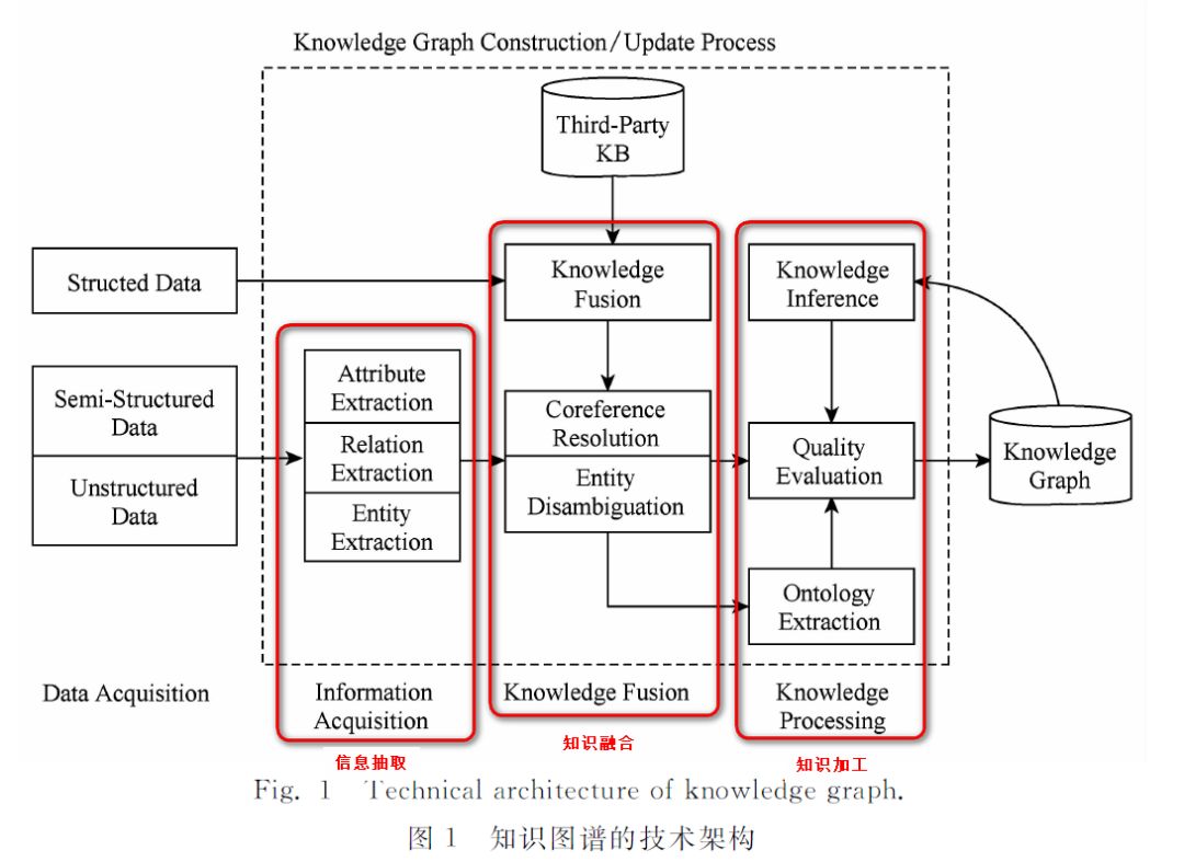 知识图谱的整体架构如图所示,其中虚线框内的部分为知识图谱的构建过程,同时也是知识图谱更新的过程。