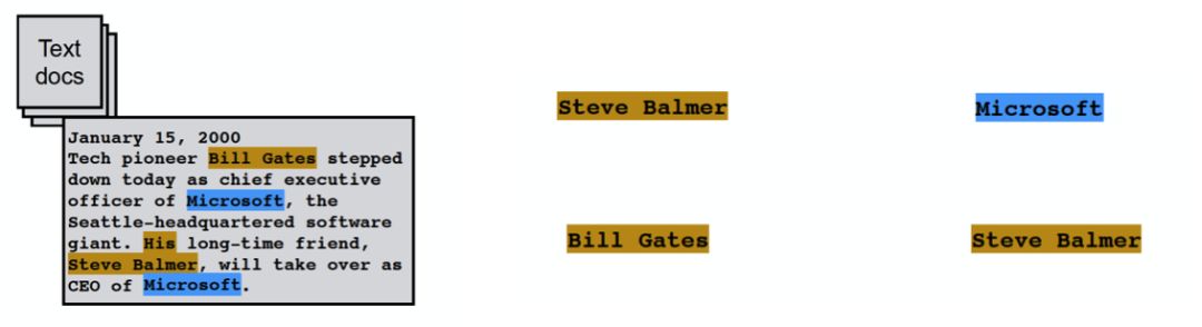 比如在下图中,通过实体抽取我们可以从其中抽取出三个实体——“Steve Balmer”, "Bill Gates",和"Microsoft"。