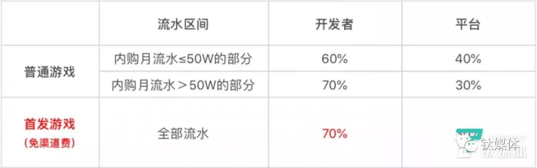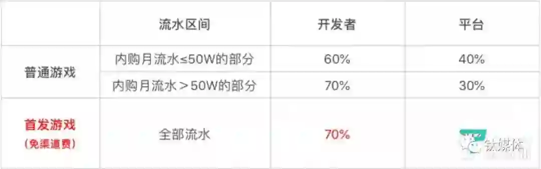 而普通游戏则采用区间分成,月流水低于50万,开发者获得60%的分成,而超过50万的部分,则享受70%的分成。