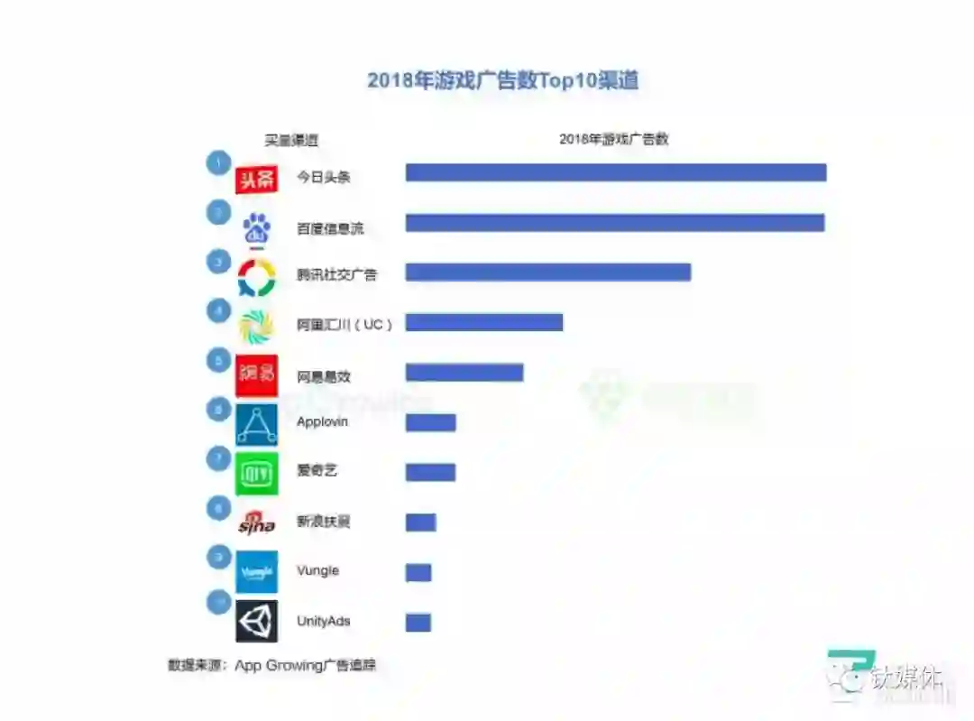 2018年游戏广告数TOP10渠道,来源App Growing《2018年游戏行业买量市场洞察》
