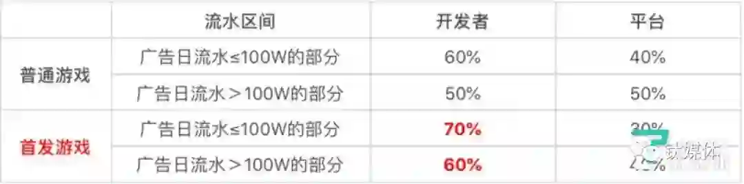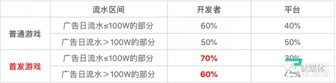 主打广告商业化的小游戏,首发游戏广告日流水低于100万的,开发者可享受70%的分成比例,超过100万的部分分成比例为60%。普通发布的游戏分成则对应下降10个百分点。