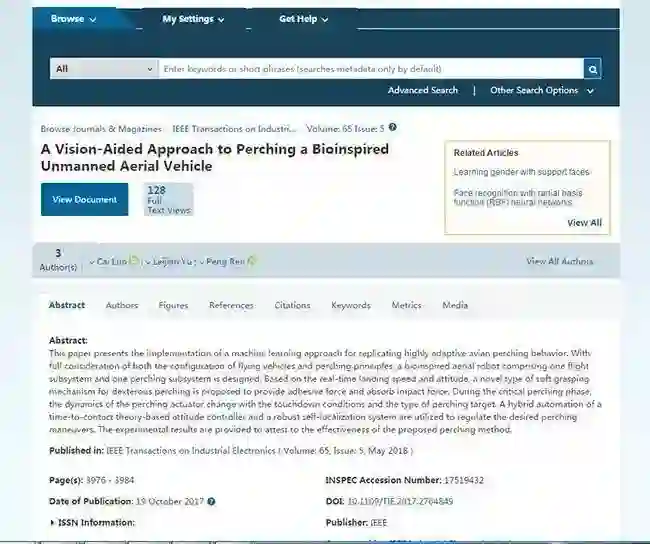 中国石油大学机电工程学院讲师罗偲、信息与控制工程学院教授任鹏在仿生无人机视觉导航研究领域的最新成果《基于视觉辅助的仿生无人机着陆控制研究》(AVision-aided Approach to Perching a Bio-inspired Unmanned Aerial Vehicle)刊发在了《电气和电子工程师协会工业电子会刊》(IEEE Transactions on Industrial Electronics)。