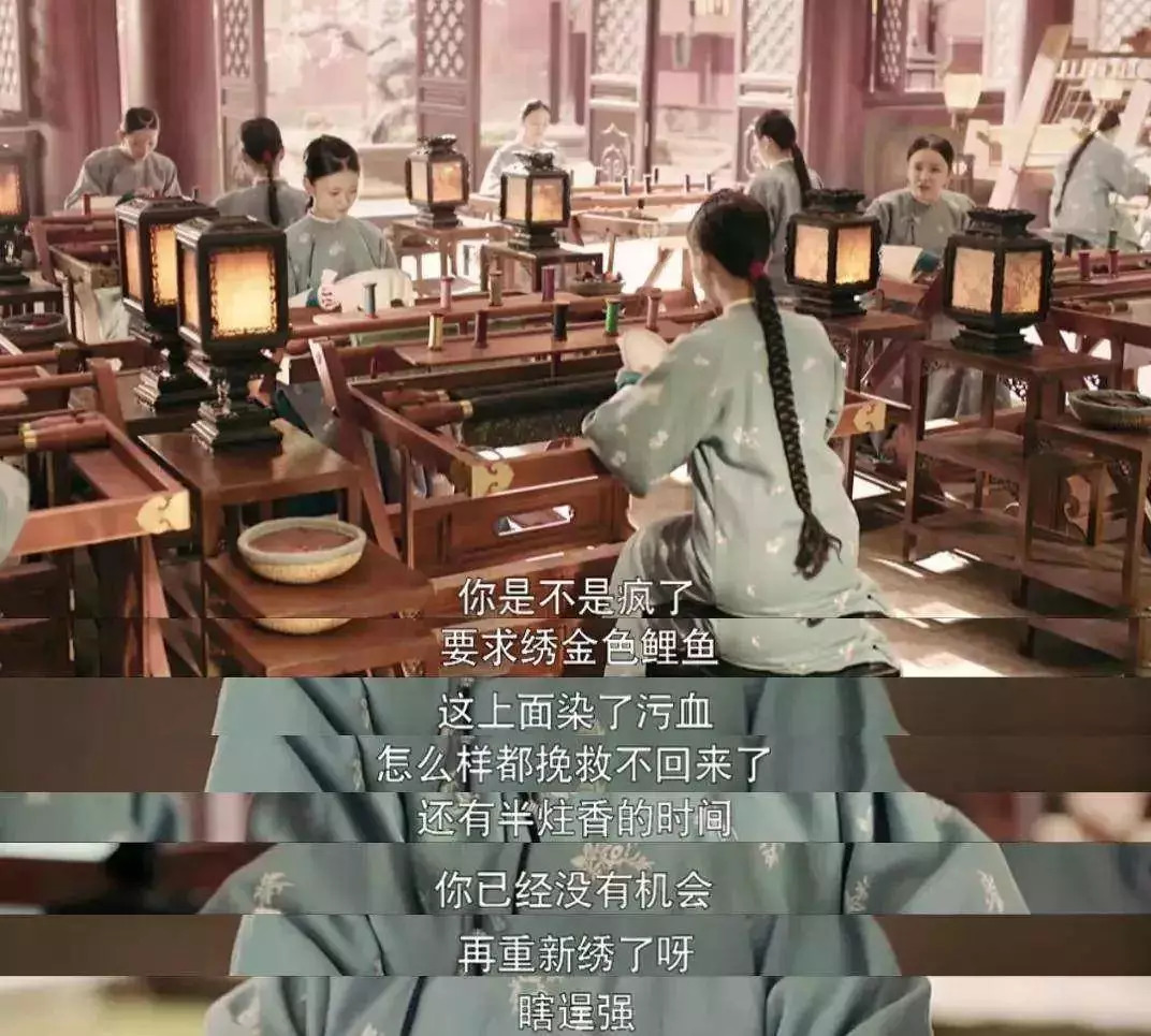 在初入宫的刺绣考核中,吉祥受伤,血染绣品,身边的人都不愿帮助她,只有魏璎珞挺身而出,主动调换自己手里的绣品,并且仅用了半柱香的功夫,就在染血的绣品上绣出了锦鸡,获得总管的最高评价。