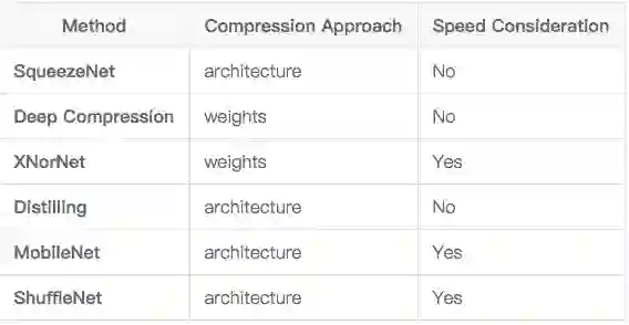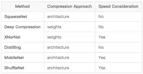 本文主要讨论如下几篇代表性的文章和方法,包括SqueezeNet[5]、Deep Compression[6]、XNorNet[7]、Distilling[8]、MobileNet[9]和ShuffleNet[10],也可按照上述方法进行大致分类: