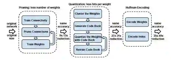 Deep Compression出自S.Han 2016 ICLR的一篇论文《Deep Compression: Compressing Deep Neural Networks with Pruning, Trained Quantization and Huffman Coding》。该文章获得了ICLR 2016的最佳论文奖,同时也具有里程碑式的意义,引领了CNN模型小型化与加速研究方向的新狂潮,使得这一领域近两年来涌现出了大量的优秀工作与文章。