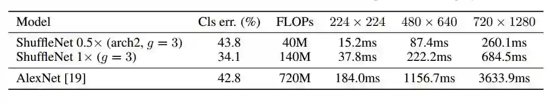 上表显示,相对于MobileNet,ShuffleNet的前向计算量不仅有效地得到了减少,而且分类错误率也有明显提升,验证了网络的可行性。