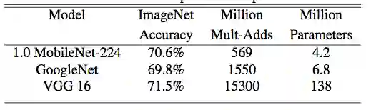 上表显示,MobileNet在保证精度不变的同时,能够有效地减少计算操作次数和参数量,使得在移动端实时前向计算成为可能。