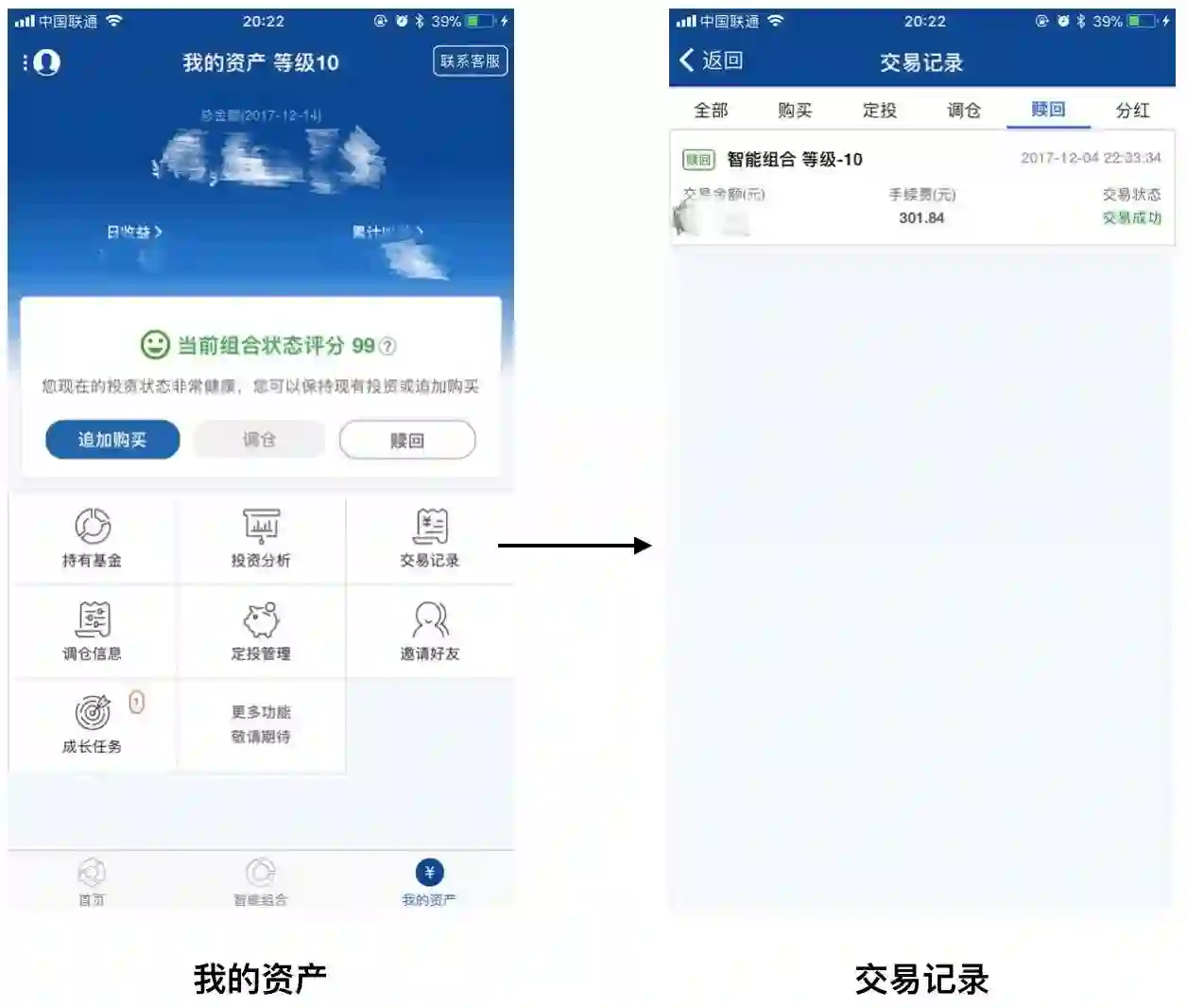 举个例子,这是某个理财APP的页面,故事是这样的,我在这个APP里投入了部分资金进行理财,恰好前两天需要用钱,所以打算赎回大部分资金。对于我这种对网上理财还是有点不放心且理财金是我大部分家当,那赎回的过程中我是不是特别关注赎回进度。可是这个APP在经过赎回确认后(资金还未到账),就显示为下面第的一个页面(跟赎回前无异,只是总金额少了),此时我的第一本能反应有点惊慌了:金额怎么这么少了?赎回的钱呢?我明明没有收到钱啊?赎回失败?... 它的做法是需要通过点击“交易记录”到“赎回”列表中去查看明细。这就是带着故事做设计,这APP的设计是满足了用户基本需求,却没有把握住故事中主人公的真正心理状态,如果在这个页面有个赎回提示,是不是更好。而且它又不是家喻户晓的产品,主要还是新用户占绝大多数。