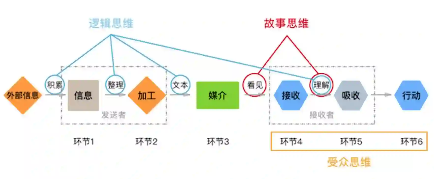 产品设计是由粗到细的活儿,从搭建产品框架到具体某个页面设计其实都是在“讲故事”。以下是信息传递模型,这个模型其实与上面说的沟通模型大同小异,重点是加入了逻辑思维、故事思维和受众思维,如果能将这三种思维在信息传递中利用起来,将会大大提高传递的效率。