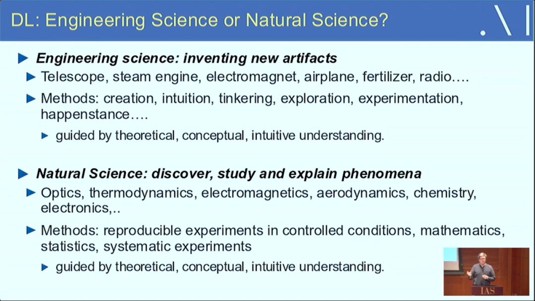 LeCun 认为,深度学习在一定程度上是一门 “工程科学”,我们通过理论洞见、直觉、灵感和经验探索来创造新的工件。但是理解深度学习在一定程度上是 “物理科学”,需要理解这个工件的一般属性。