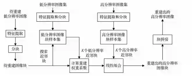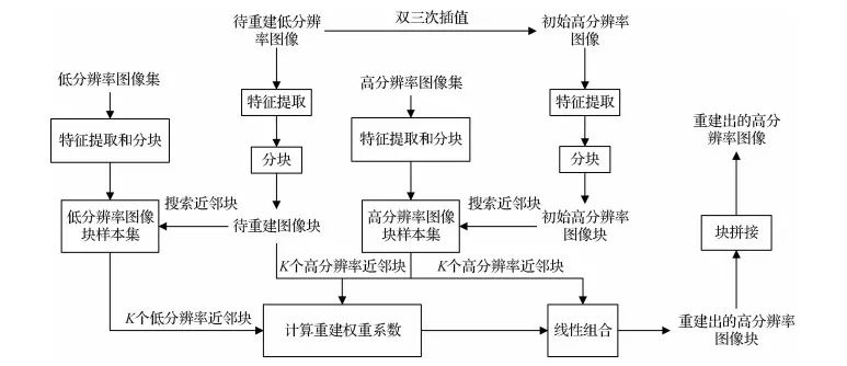 假设高分辨图像块与其对应的低分辨率图像块具有相似的局部几何结构。根据上述假设,求取输入的低分辨率图像块与训练样本库中的低分辨率图像块之间的线性关系,并将其映射到高分辨率图像块上,进而重构出高分辨率的图像块。基于邻域嵌入的超分辨率重建主要分为两部分,样本库的建立和匹配重建。