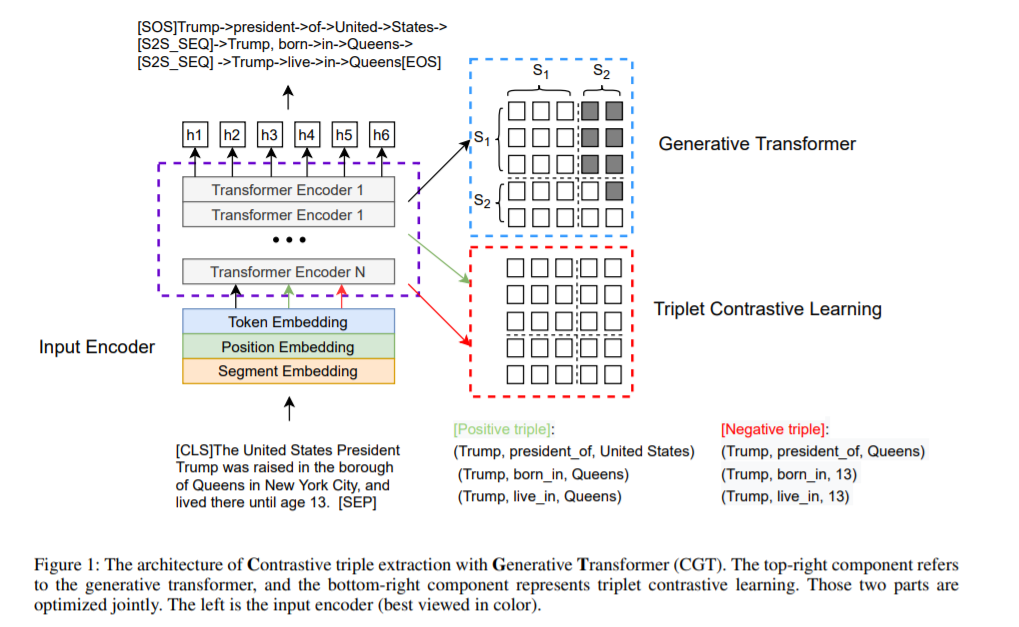 为了解决这些问题,我们引入了带有生成变换器(CGT)的对比学习三元组提取框架,该框架是一个共享的Transformer模块,支持编码器-解码器的生成式三元组对比学习多任务学习。首先,我们使用分隔符和部分因果掩码机制将输入序列与目标序列连接起来,以区分编码器-解码器表示形式。除了预先训练的模型之外,我们的模型不需要任何其他参数。然后,我们介绍了一种新颖的三元组对比学习对象,该对象利用真实的三元组作为正实例,并利用随机令牌采样将损坏的三元组构造为负实例。为了共同优化三元组生成对象和对比学习对象,我们引入了分批动态注意掩码机制,该机制允许我们动态选择不同的对象并共同优化任务。最后,我们介绍了一种新颖的三元组校准算法,以在推理阶段滤除虚假三元组。