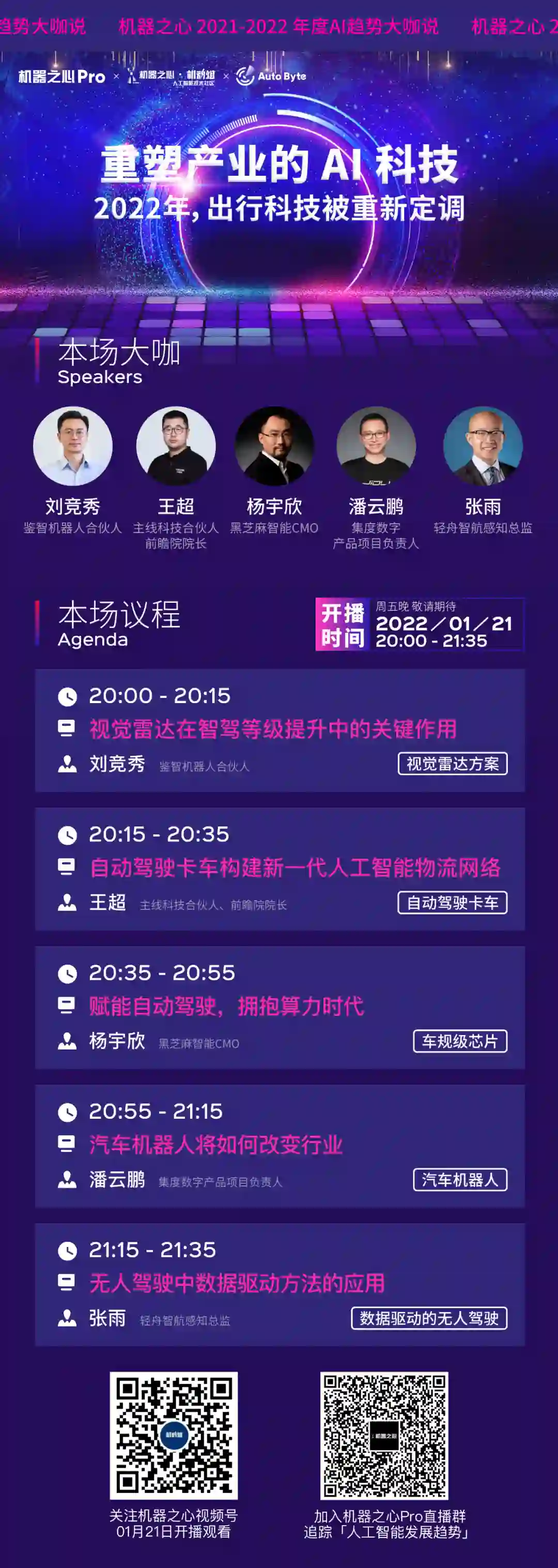 作为「与 AI 俱进,化时光为翎」机器之心 2021-2022 跨年特别策划中的重要组成部分,「机器之心 2021-2022 年度 AI 趋势大咖说」聚焦「驱动未来的 AI 技术」与「重塑产业的 AI 科技」,推出线上分享,邀请行业精英、读者、观众共同回顾 2021 年中的重要技术和学术热点,盘点 AI 产业的年度研究方向以及重大科技突破,展望 2022 年度 AI 技术发展方向、AI 技术与产业科技融合趋势。 本次线上分享会为期两周,分为两个主题周,第一周主题为「重塑产业的 AI 科技」,将于 2022 年 1 月 17 日——2022 年 1 月 21 日期间分为五期进行,来自博世中国、小冰公司、大地量子、实在智能、天壤智能、来也科技、亮亮视野等近 20 家企业的大咖嘉宾将分别做客「机器之心 2021-2022 年度 AI 趋势大咖说」直播间,围绕「技术升级」、「产业革新」两大方向,「企业 IT」、「AI for Science」、「智能驾驶与出行」等三大人工智能重点应用产业的发展趋势,尽可能的呈现 AI 未来的发展脉络。