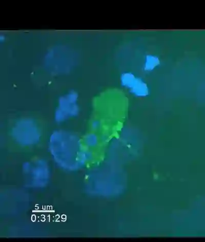 在上面的图片中,被感染了 HIV 的 T 细胞呈现为绿色,一旦与上皮细胞接触,病毒学突触就开始形成,如视频中所示,正是这一条条伸出的绿色恶魔“手臂”,将病毒传递给了其他健康细胞,完成感染。