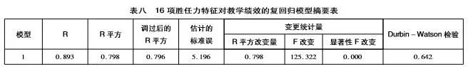将两个量表采集的数据合并,以SPOC混合教学胜任力特征自测量表16个特征值作为自变量(预测变量),绩效评价表的得分为校标变量,进行复回归分析。在回归分析前先计算16个预测变量的积差相关矩阵,结果显示相关系数介于0.412至0.723之间,表示预测变量之间呈中低度相关;检测容忍度(Tolerance)值均在0.3左右,方差膨胀系数(VIF)均小于3.6(﹤评鉴指标值10),说明预测变量间只存在可忽略的轻微多元共线性问题,变量间的数据关系满足做回归分析的基本假定,表八是复回归的模型摘要表。