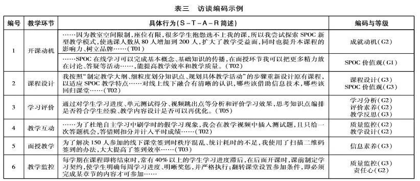 本研究根据实际条件采用现场访谈和微信视频访谈相结合的方式,让受访者回忆自己开设SPOC以来的教学经历,对印象最深刻(认为最成功或最具挫败感)的教学事件(或教学环节)进行叙述,叙述方法采用STAR法(李德方,2015),即包括事件发生的情境、要解决的任务、采取的行动、处理结果及影响等,尽可能确切回忆当时的对话、行动和结果。采访者使用探测技术深入询问、了解事件,对访谈对象的评价基于其行为表现,而非个人的主观感受或直觉。