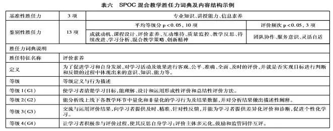本研究最终所构建的SPOC混合教学胜任力模型包含3项基准性特征和13项鉴别性特征,并对每一项特征给予了定义和等级说明(见表六)。需要说明的是,胜任力词典初稿中部分特征项在访谈内容编码和分析结束后,其定义和等级描述得到了局部修正,以更准确地表达SPOC混合教学情境下的胜任力。