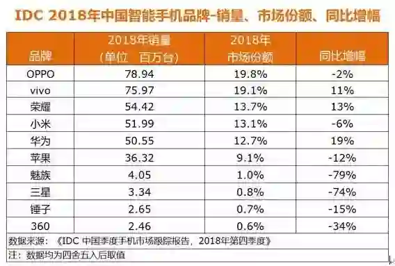 IDC全年中国手机市场数据:荣耀销量首进前三