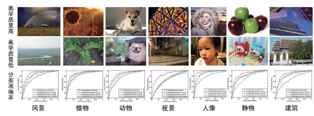 2013年12月,文献研究进一步深入后,成果发表于多媒体领域著名期刊《IEEE Transactions on Multimedia》。文献根据7种内容的图像(风景、植物、动物、夜景、人像、静物、建筑),分析并提取了一系列基于内容的图像特征,利用基于内容的图像特征与支撑向量机,进行图像视觉美学质量的分类,能够显著提高图像视觉质量评价的准确度(图5)。近期基于内容的图像美学质量评价受到了越来越多的研究者的关注,大多集中于人脸图像和人像图像方面。