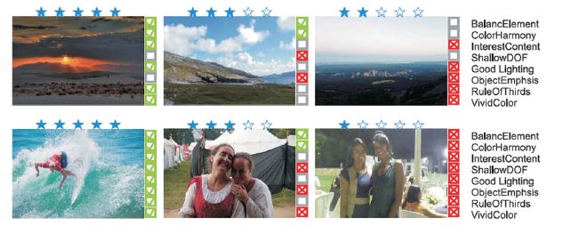2004年,微软亚洲研究院与清华大学自动化系联合提出了一种方法,能够自动区分专业摄影师拍摄的照片与普通用户拍的照片,该项工作被认为是图像美学质量评价最早的一篇论文,研究者收集了16643幅专业摄影师拍摄的照片,以及12897幅普通用户拍摄的照片,使用了21类共846维图像低层特征学习分类模型,从而对测试图像进行美感分类。此外,研究者还收集了379幅图像,每一幅图像请16名测试者(8名男性与8名女性)根据图像美感进行评分(1~5档:差、不好、中等、好、卓越),将每幅图像的平均得分作为其真实的人类评分数据,由此学习回归模型,能够对测试图像进行美感评分,如图4所示。