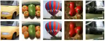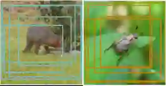 这样为什么能奏效呢?研究者首先分析了随机剪裁的性质。在 SimCLR 论文中提到,随机剪裁是对比学习方法中非常重要的数据增强策略。在 ImageNet-1K 数据集中,图像的主体对象大多处于图像的中心区域,而对图像进行随机剪裁,中心区域有很大的概率被囊括进去,例如下图展示的几个例子,几次剪裁基本都包括了图像的主体对象。