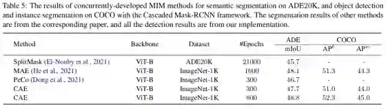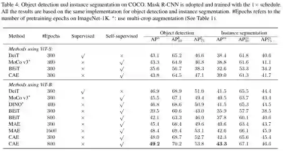 该研究使用 Mask-RCNN 和 Cascade-RCNN 两种网络结构进行目标检测和实例分割的实验。其中,使用多尺度训练 12 epoch,测试阶段仅使用单尺度测试。实验结果和语义分割类似:对比学习方法和监督预训练方法的结果类似且较差,CAE 的结果更好。