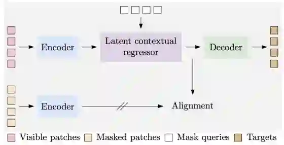 CAE 设计的核心思想是对 “表征学习” 和 “解决前置任务” 这两个功能做分离。研究者希望在预训练时,编码器只负责表征学习,解码器只负责解决前置任务,这样可以尽可能大地挖掘编码器的潜力。CAE 包括 4 个部分:(1) Encoder; (2) Latent contextual regressor; (3) Decoder; (4) Alignment模块。