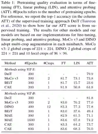 研究者发现一些有趣的现象。(1) 对比学习方法 (MoCo v3, DINO) 的线性探测和注意力探测结果类似。这说明这类方法在预训练时已经将注意力放到了图像的主体对象上面,无需进一步动态筛选即可做好图像分类,这也与之前研究者对对比学习的分析一致。(2) MIM 方法 (例如 CAE) 的注意力探测相比线性探测有很大的提升。这说明 MIM 方法学到了每个 patch 的特征,而不仅仅是图像主体对象的,因此需要做一些筛选才利于图像分类。