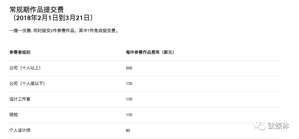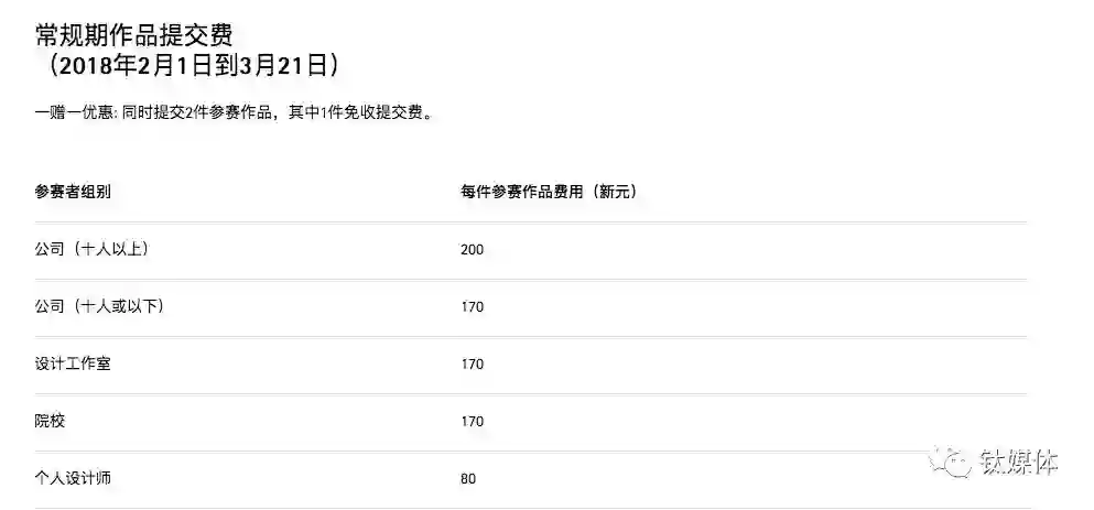 根据钛媒体查询的最新数据,在优惠期作品提交费中(2018年1月2日到1月31日),公司规模超过十人以上的,每件参赛作品费用是150新加坡元。公司规模在十人或以下的每件作品是130新元。此外还有“一赠一优惠”活动:同时提交2件参赛作品,其中1件免收提交费。