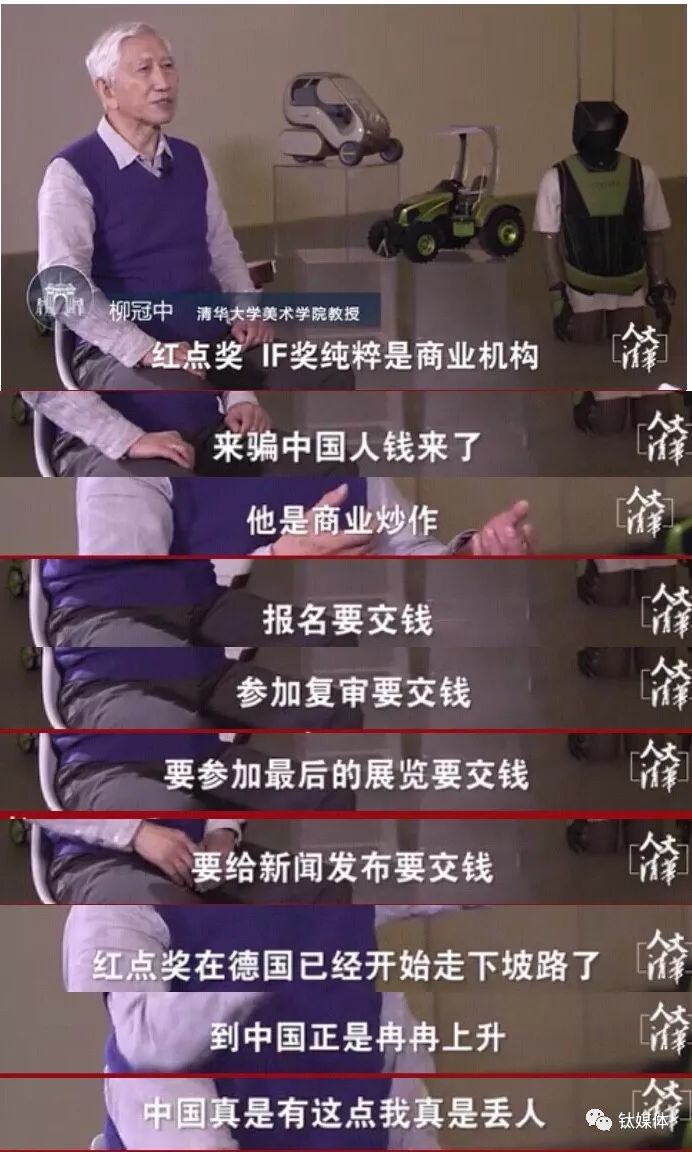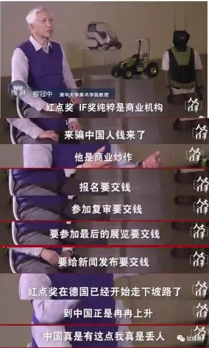 但柳冠中教授认为,红点奖、IF奖等设计大奖中有中国的获奖产品并不能证明中国设计正在崛起,“红点奖、IF奖纯粹是商业机构来骗中国人钱。”