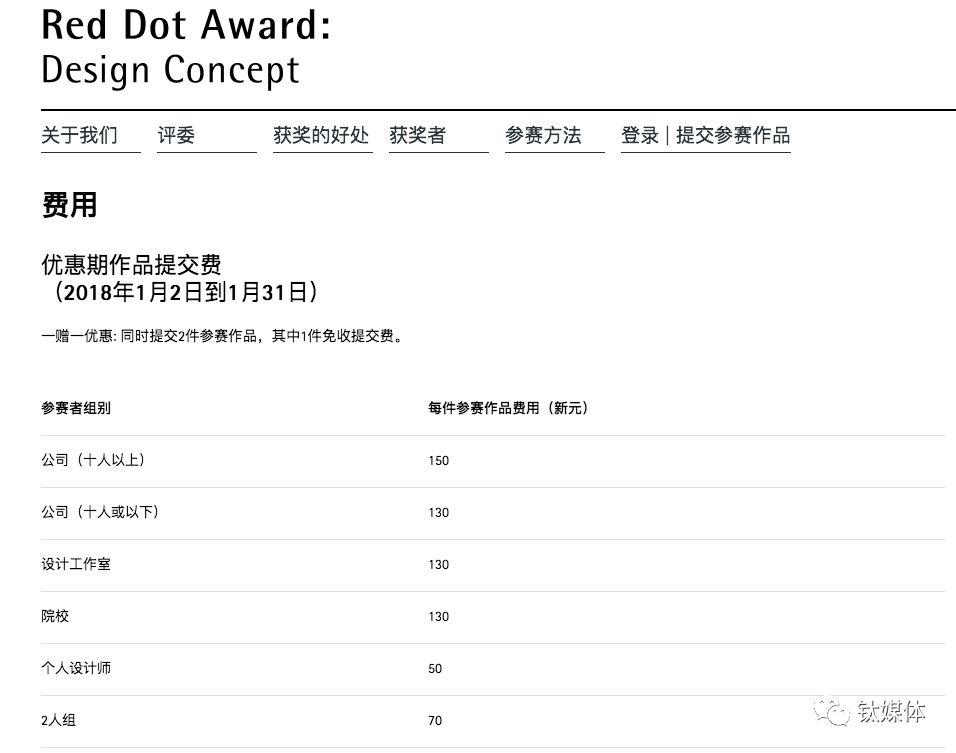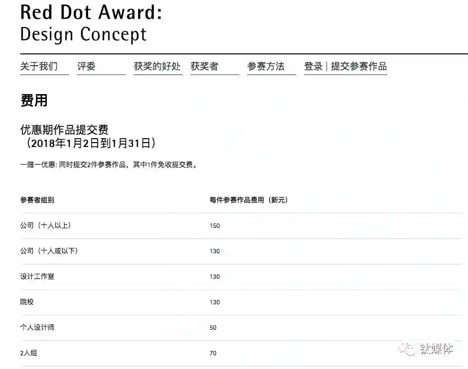 (常规期作品提交费,数据来源红点奖官网)