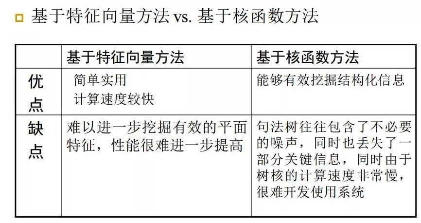目前的主要方法主要是机器学习的方法,将关系实例转换成高维空间中的特征向量或直接用离散结构来表示,在标注语料库上训练生成分类模型,然后再识别实体间关系。基于特征向量的方法主要考虑如何获取各种有效的词法、语法、语义等特征,并把它们有效地集成起来,从而产生描述实体语义关系的各种局部特征和简单的全局特征,而核函数的方法主要考虑如何有效挖掘反映语义关系的结构化信息及如何有效计算结构化信息之间的相似度。其优缺点如下图所示。